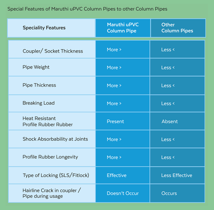 In the existing ecological system, aggressive ground water contains acid base, salt and chemicals. It is strong enough to corrode even metal pipes rapidly, and over a period of time, it leads to affect the earth with serious consequences. MARUTHI pipes strive to overlook this hazard with an innovative range of uPVC column pipes designed with two Special Locking Systems called, SLS Locking System and Fit Lock System.