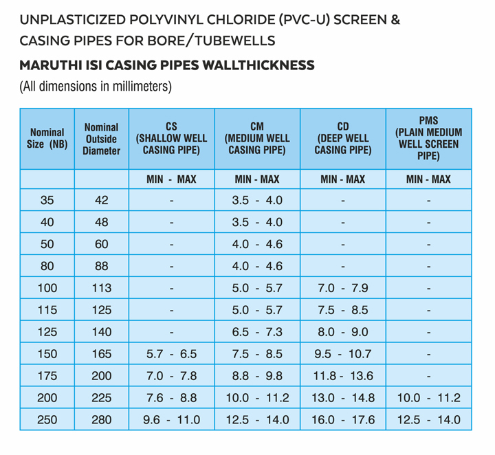 At MARUTHI, we are in the pursuit of innovation to meet the growing market demands by offering an extensive array of durable uPVC Casing pipes from 140" to 280" OD that are used for various underground applications. We have been able to become the leading Plastic Casing Pipes Exporters and Suppliers with a diverse range of pipes in adherence to IS:12818-1992 standards.